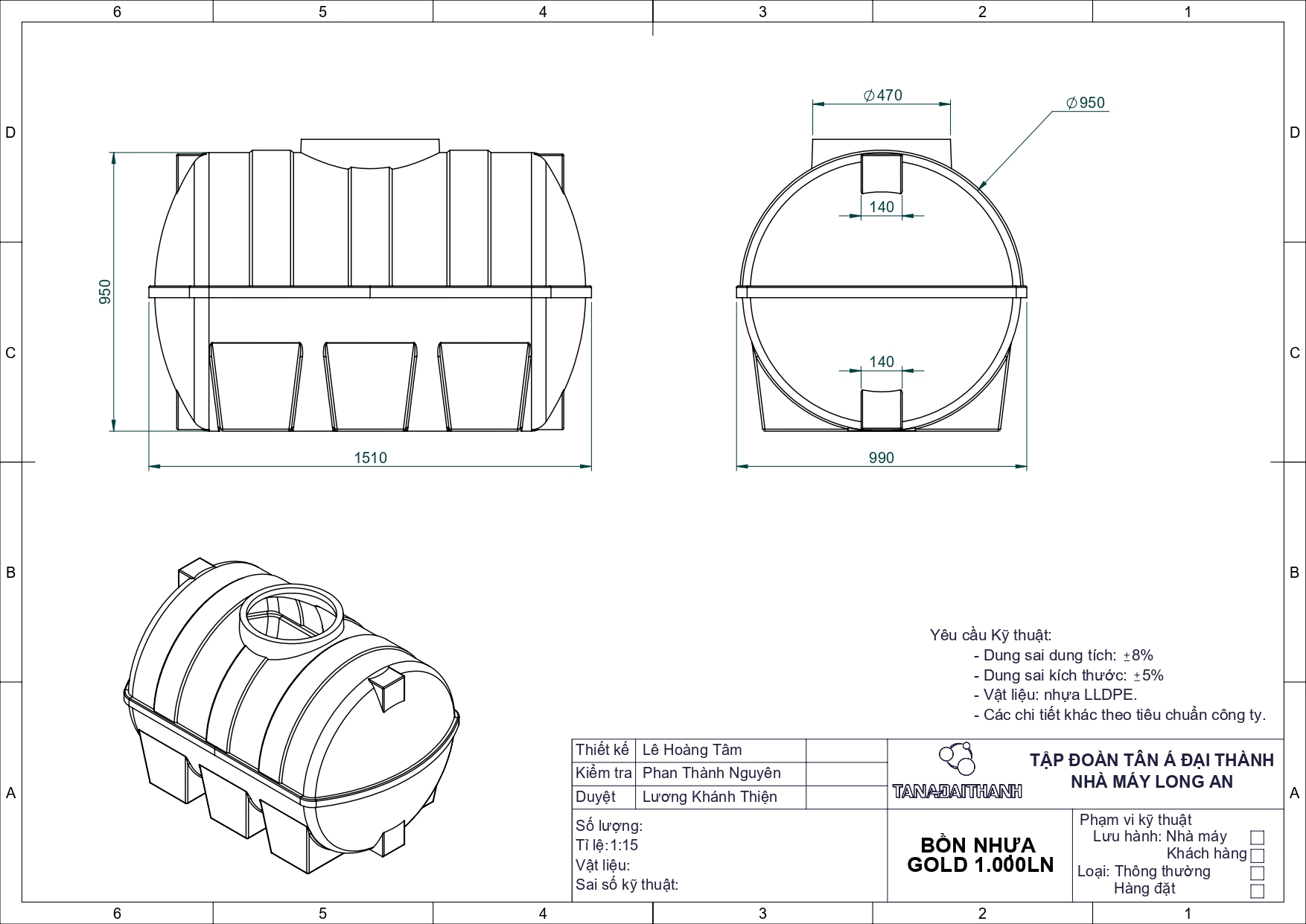 Lưu ý: Thông số kỹ thuật bồn nước nhựa 1000 lít nêu trên có dung sai ±8% (theo bản công bố chất lượng sản phẩm). Các thông số trên có thể được thay đổi bởi nhà sản xuất mà không cần báo trước.