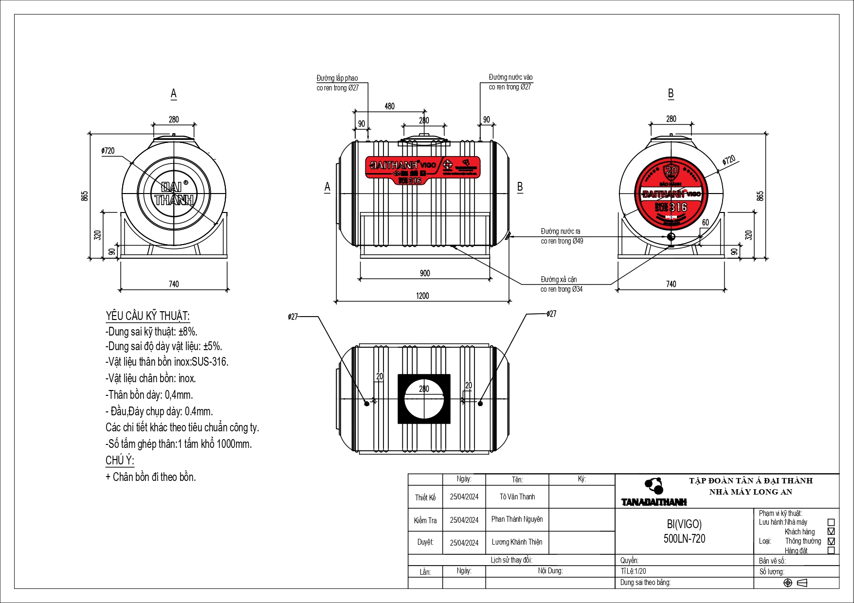 Lưu ý: bồn nước inox 500L SUS 316 nêu trên có dung sai ±8% (theo bản công bố chất lượng sản phẩm). Các thông số trên có thể được thay đổi bởi nhà sản xuất mà không cần báo trước.