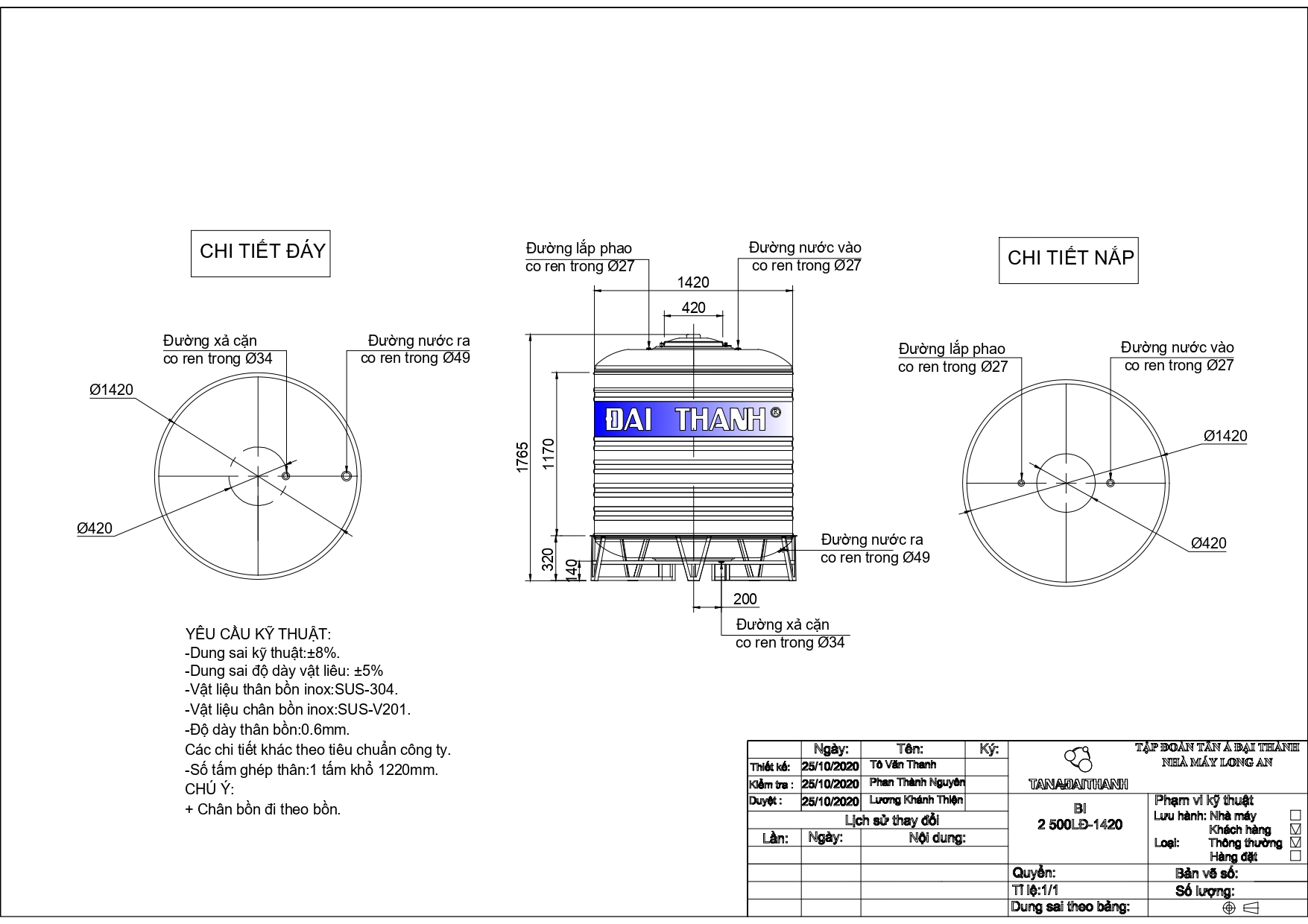 Lưu ý: bồn nước inox 2500L nêu trên có dung sai ±8% (theo bản công bố chất lượng sản phẩm). Các thông số trên có thể được thay đổi bởi nhà sản xuất mà không cần báo trước.