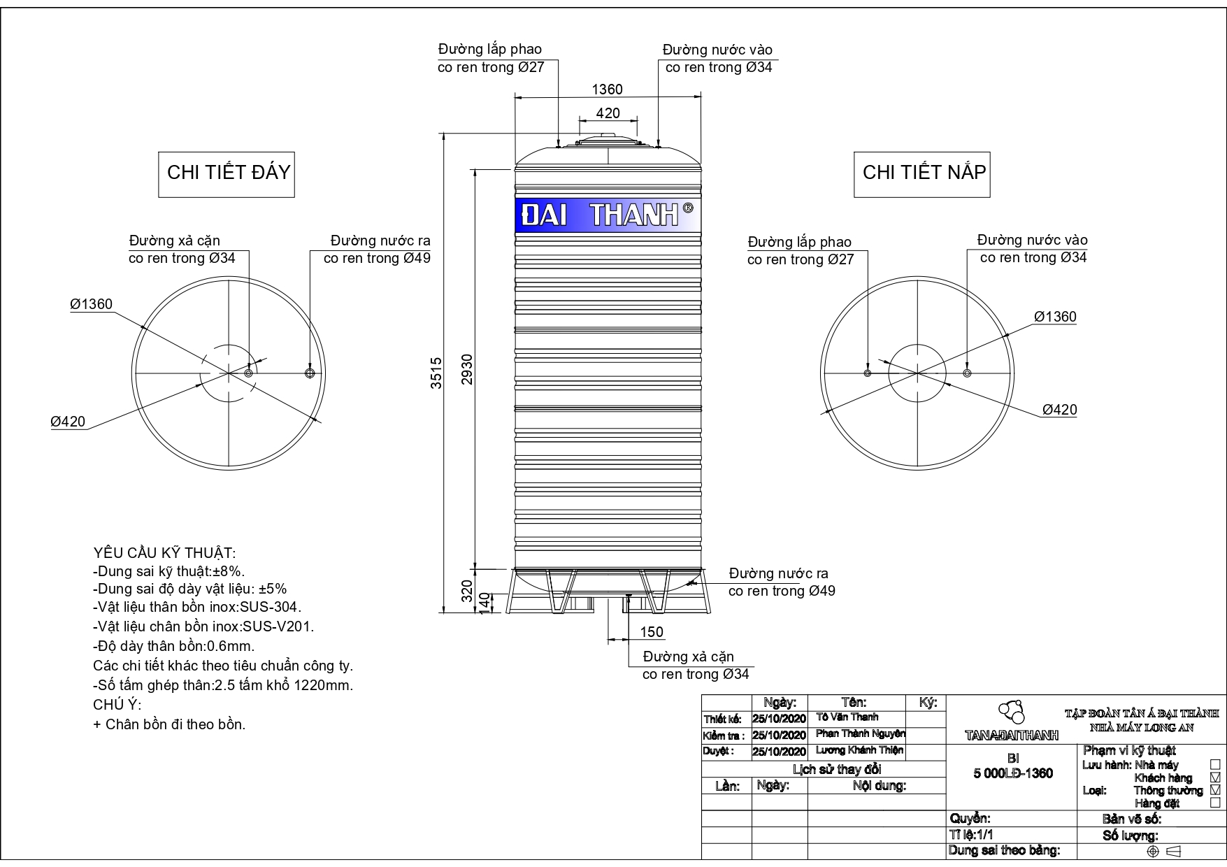 Bản vẽ bồn nước inox Đại Thành 5000 lít đứng Bồn nước inox 5000L Đại Thành đứng có những tính năng nổi bật sau: