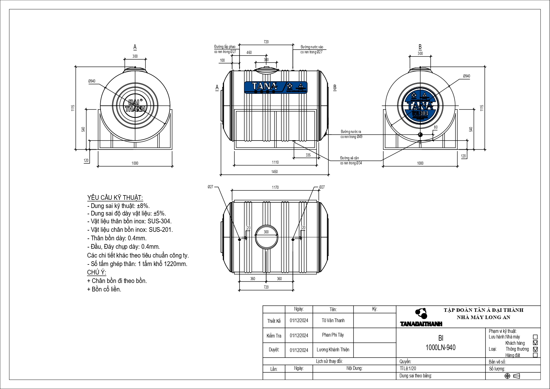 Bản vẽ bồn nước inox Tân Á 1000 lít ngang