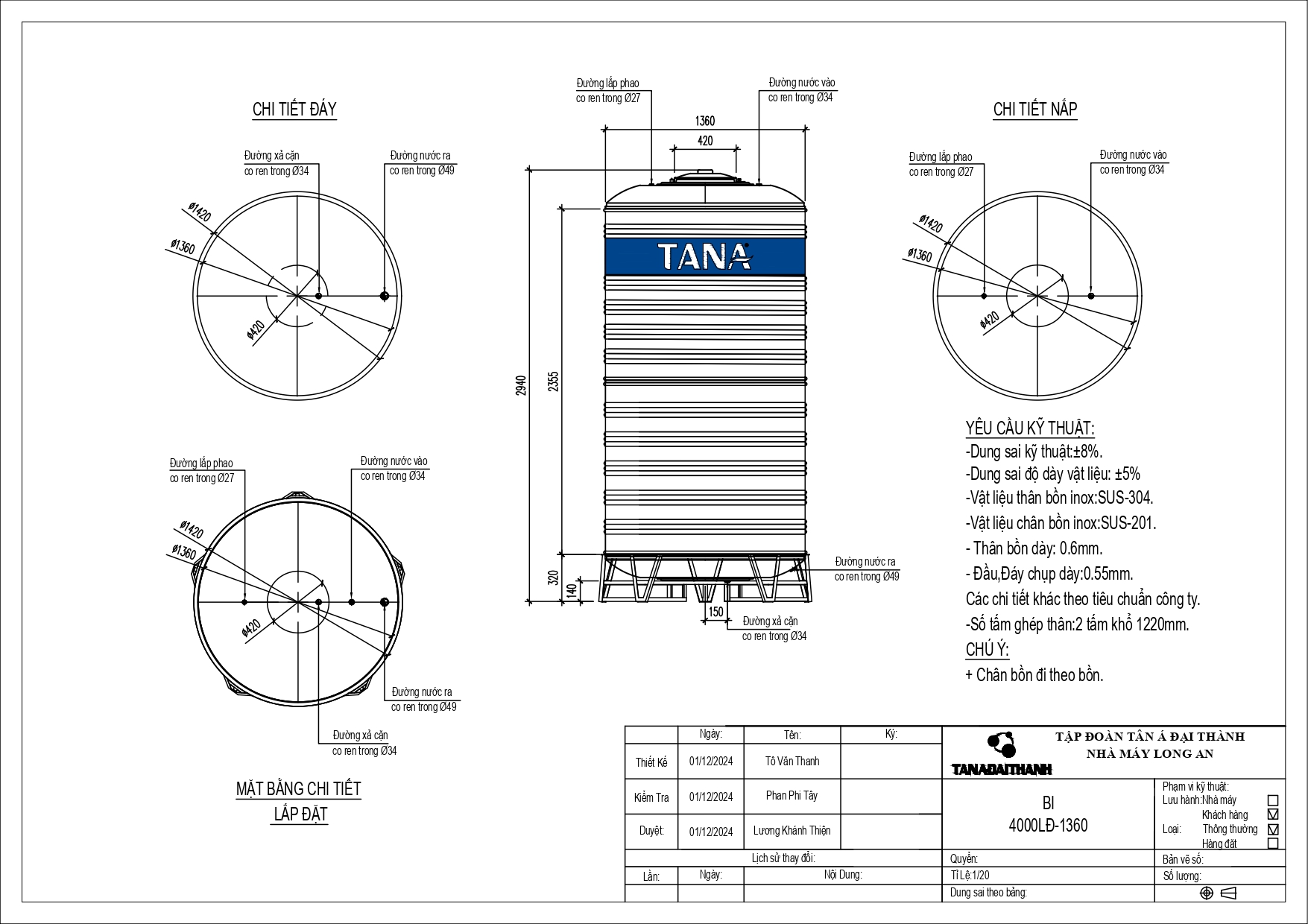 Bản vẽ bồn nước inox Tân Á 4000 lít đứng