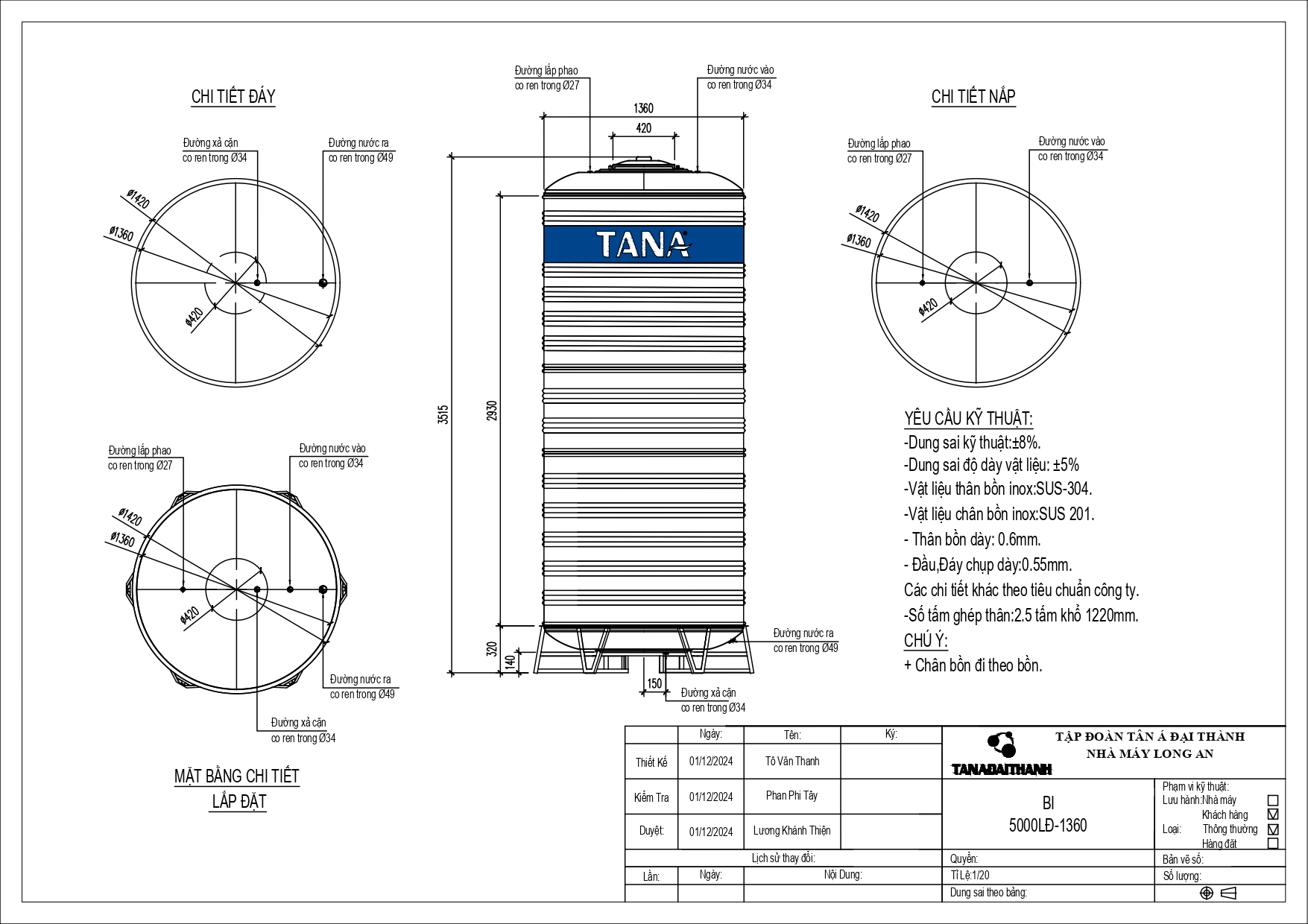 Bản vẽ bồn nước inox Tân Á 5000 lít đứng
