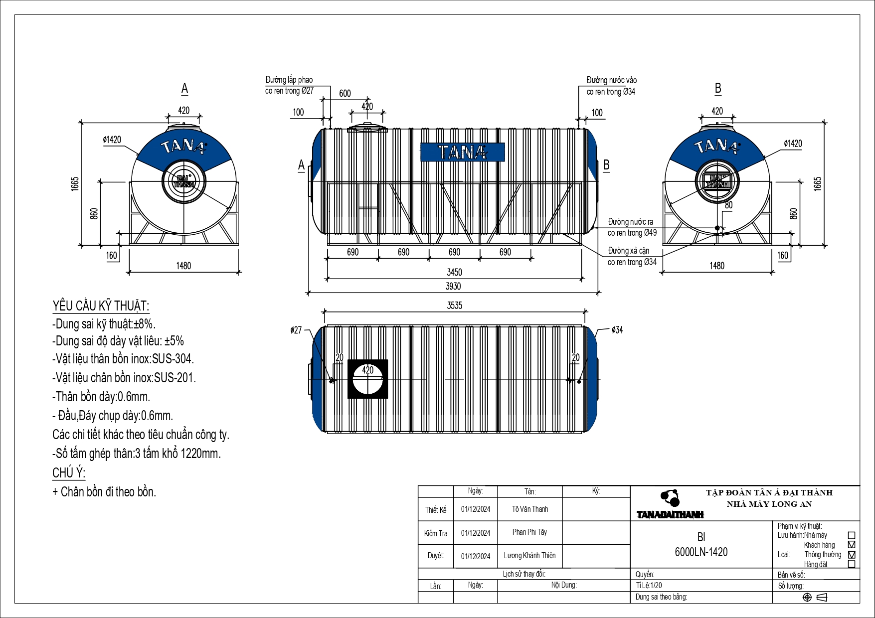 Bản vẽ bồn nước inox Tân Á 6000 lít ngang