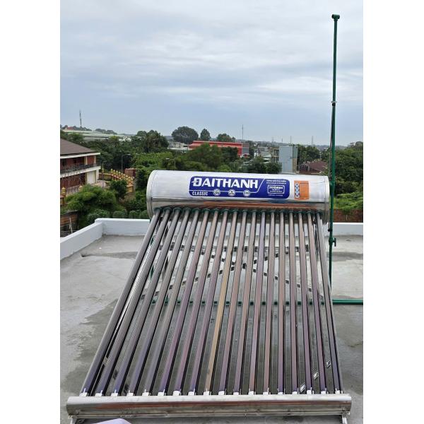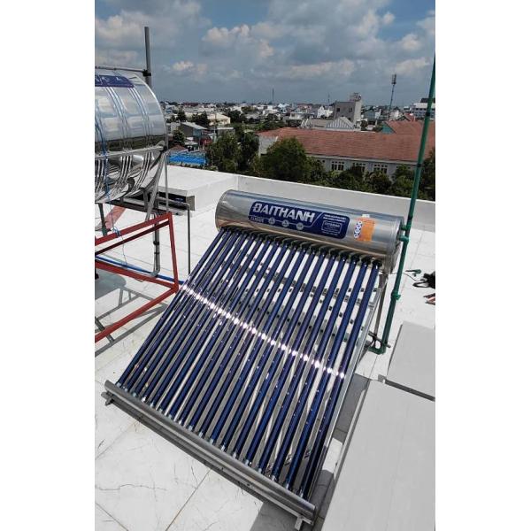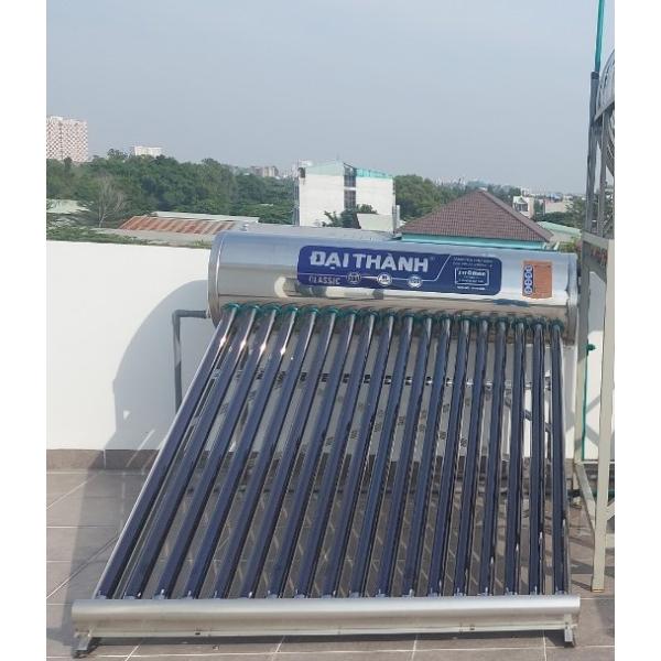 - Máy nước nóng năng lượng mặt trời Đại Thành được sản xuất theo công nghệ Châu Âu. Đặc biệt nguyên liệu Inox SUS 304/BA và công nghệ phun sơn tĩnh điện nên rất thích hợp các khu vực có khí hậu đại dương và các vùng có độ PH cao.