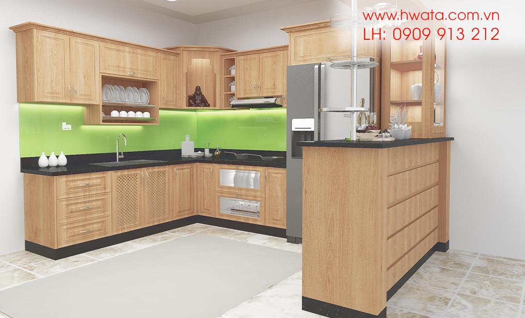 tủ bếp chữ L gỗ xoan đào tự nhiên sang trọng