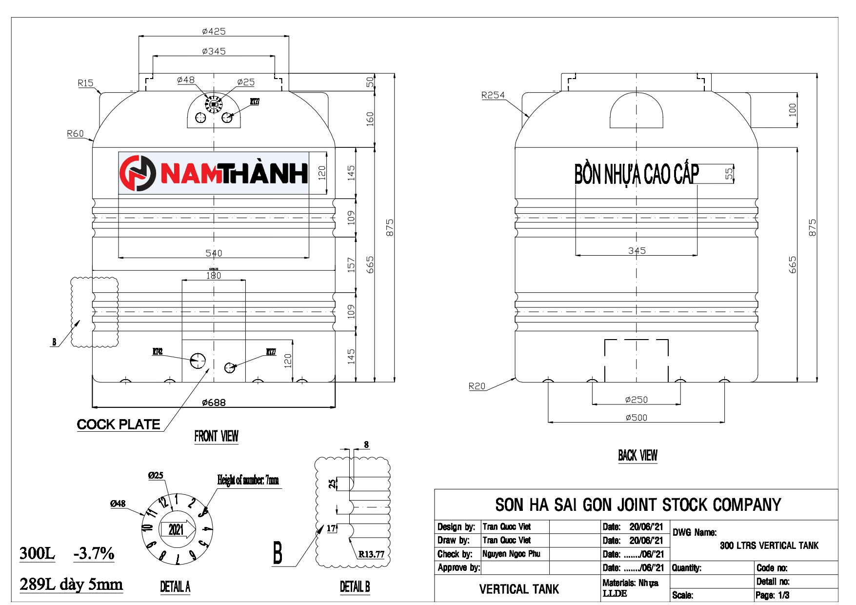 Bản vẽ bồn nhựa Nam Thành 300 lít
