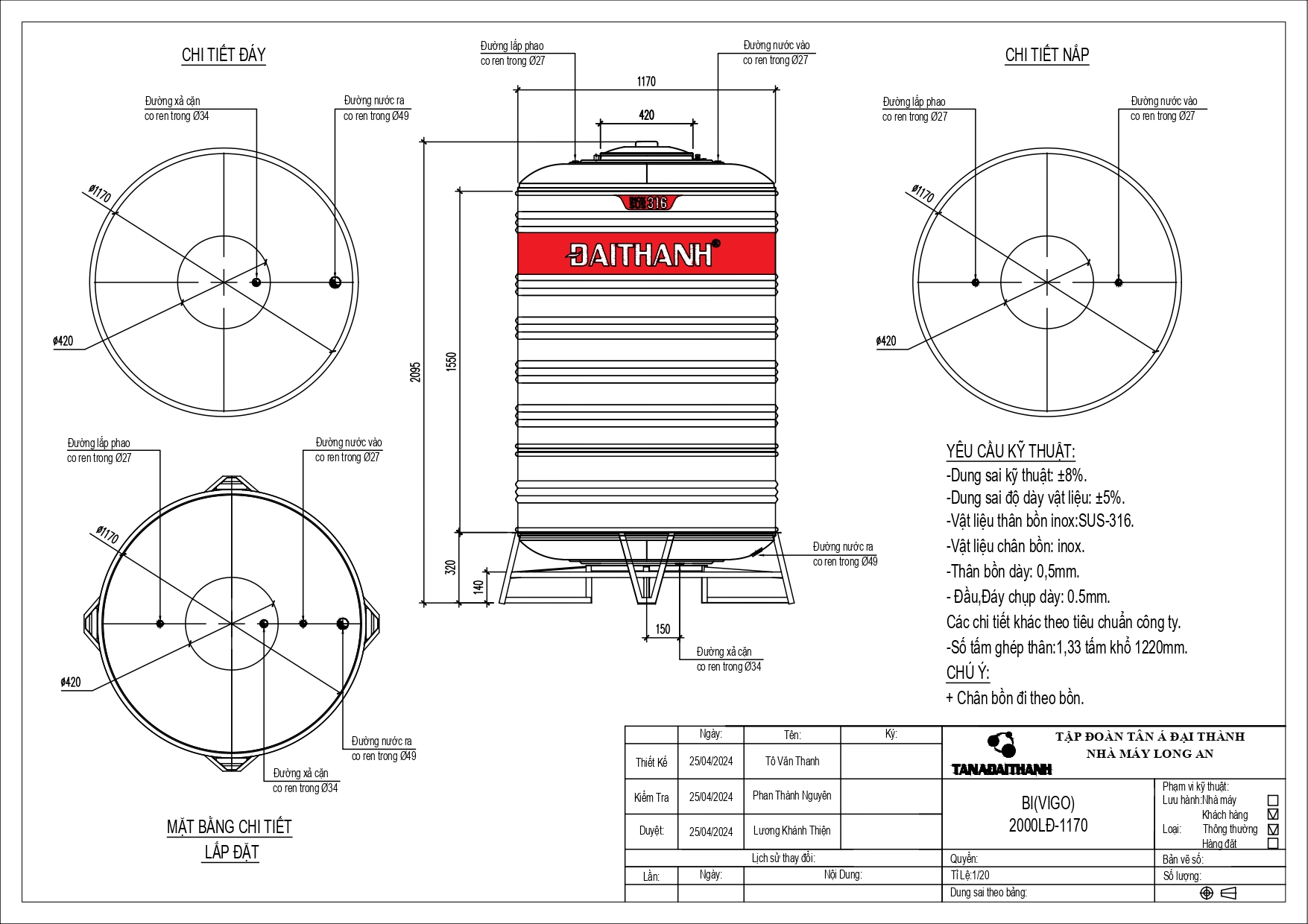 Bản vẽ bồn nước inox Đại Thành VIGO 2000 lít