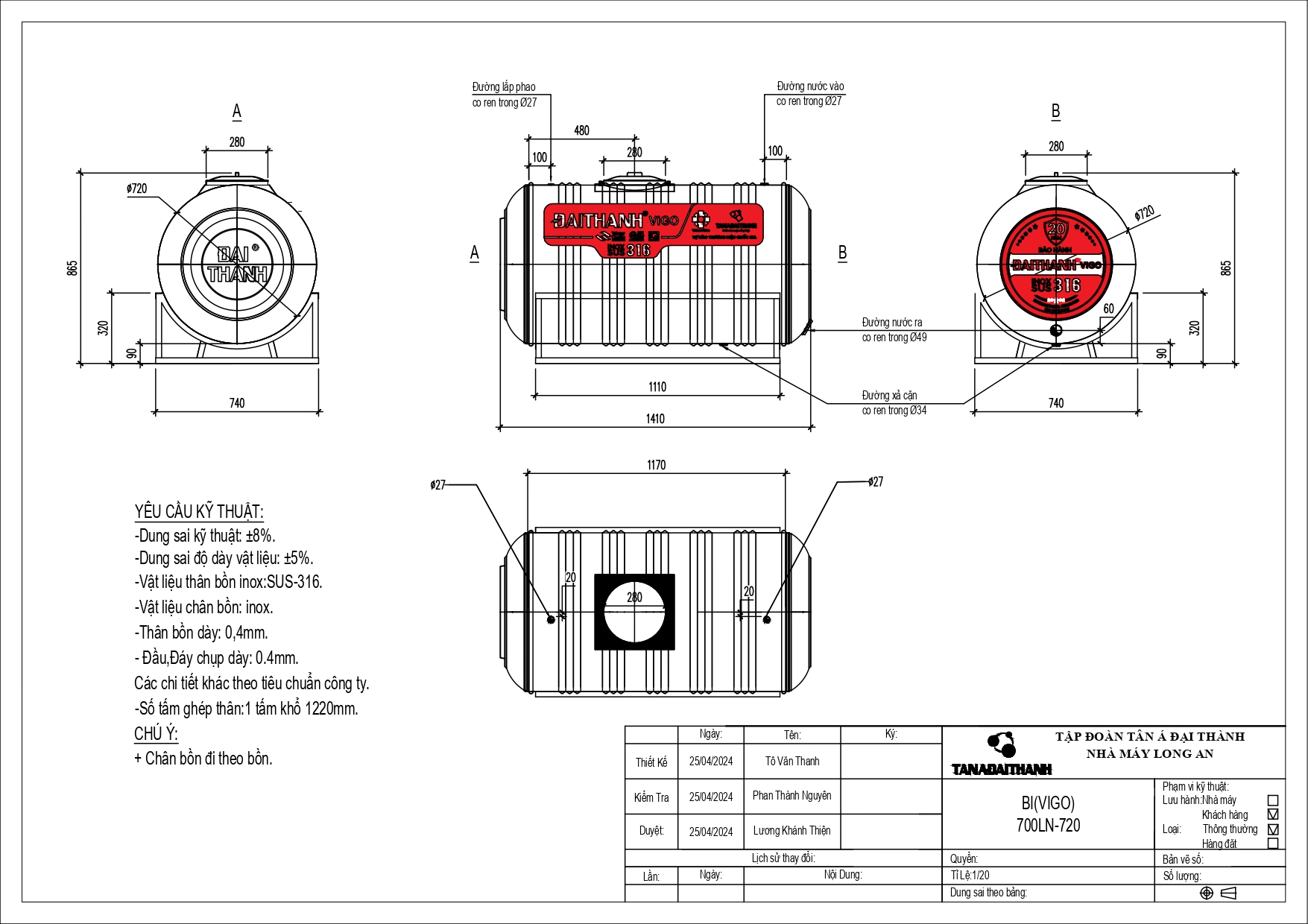 Thông số kỹ thuật bồn inox 700L SUS 316 Đại Thành