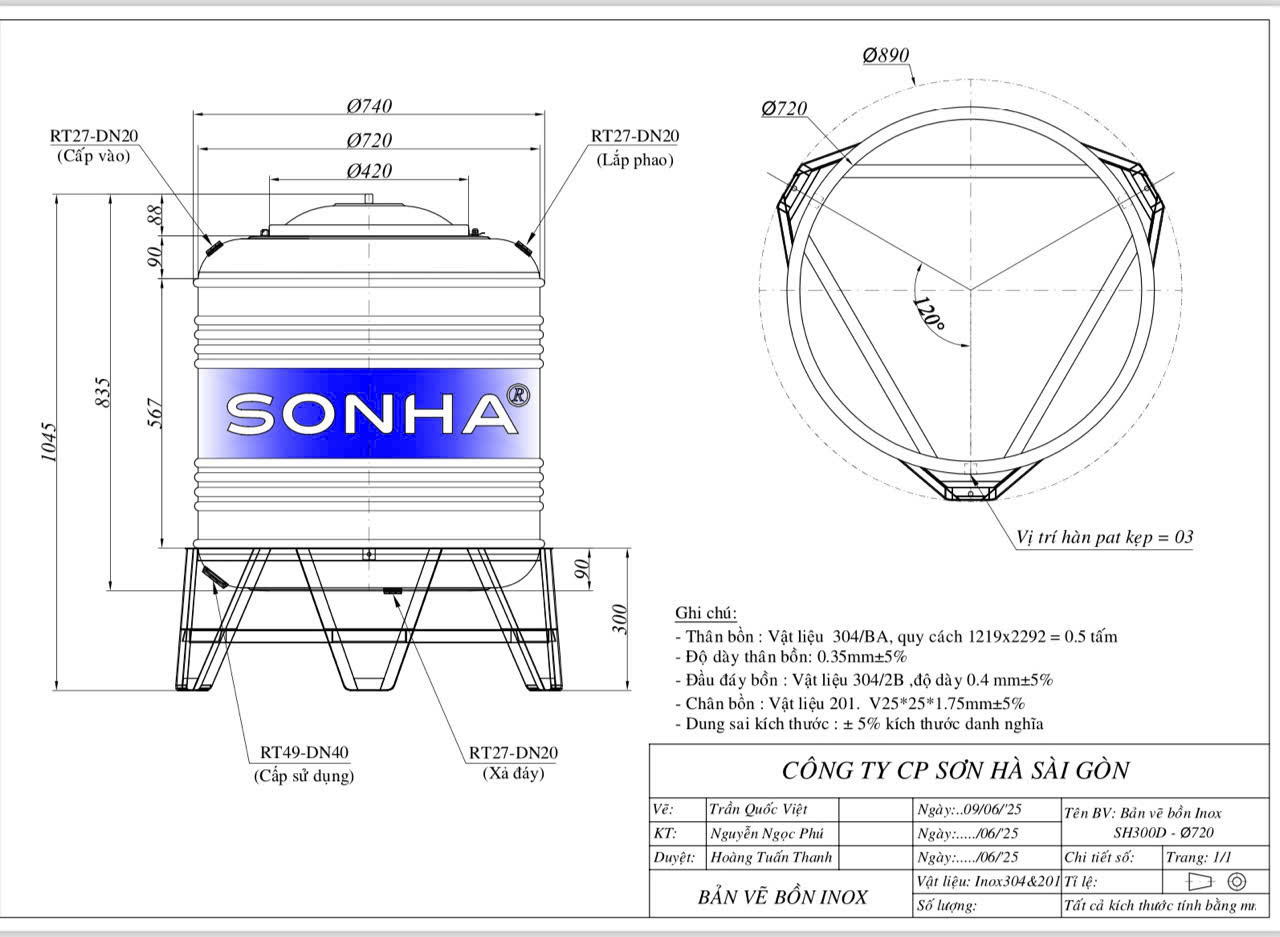 Bản vẽ bồn nước inox Sơn Hà 300 lít đứng Với chất lượng dẫn đầu thị trường, bồn nước inox Sơn Hà luôn là mục tiêu hàng đầu của các cơ sở làm bồn nước giả. Khách hàng lưu ý các đặc điểm nói trên của bồn nước Sơn Hà để có thể mua được bồn nước với chất lượng tốt, thời gian sử dụng lâu hơn, đảm bảo quyền lợi của người tiêu dùng. Cam kết của NPP Toàn Phát