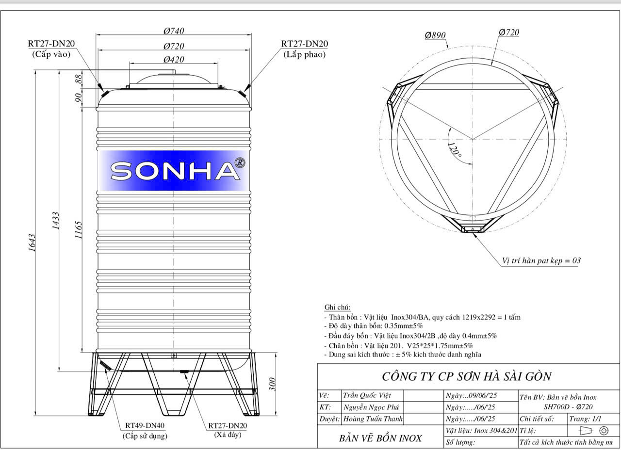 Bảng vẽ chi tiết bồn nước inox 700L Sơn Hà đứng