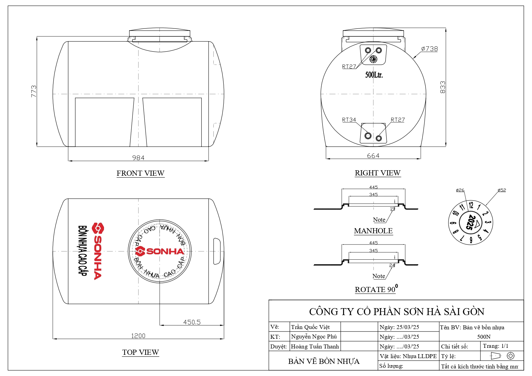 Bản vẽ bồn nước nhựa Sơn Hà 500 lít ngang