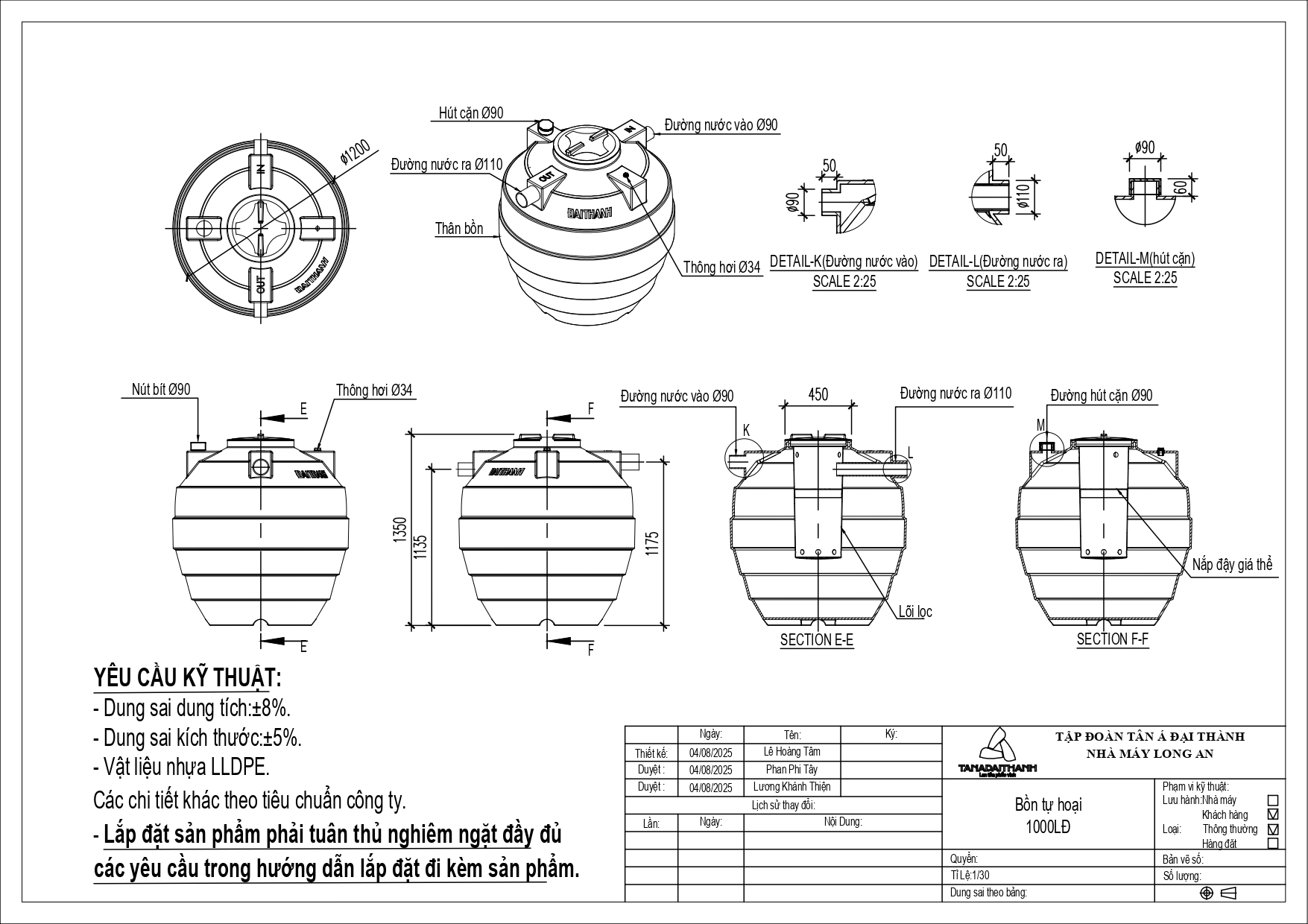 Bản vẽ bồn tự hoại Đại Thành 1000 lít Kích thước bồn tự hoại 1000L Đại Thành