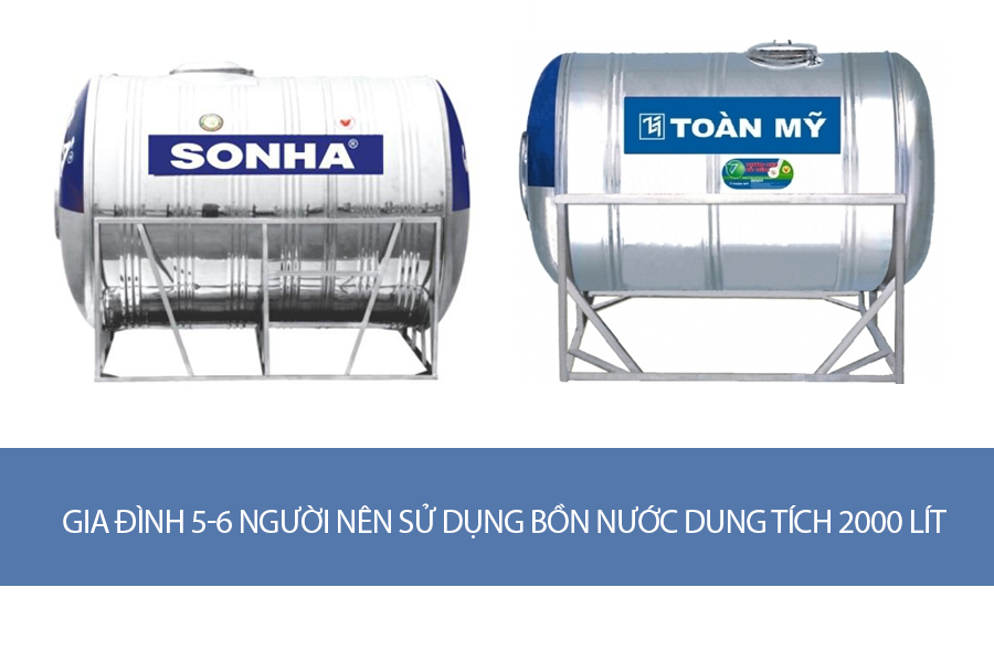 | Thông thường , một hộ gia đình ở Việt Nam có khoảng 5-6 người ( bao gồm Ông/Bà , Bố/Mẹ , 2 con) , nên lựa chọn bồn nước dung tích 2000l thì thoải mái sử dụng. |