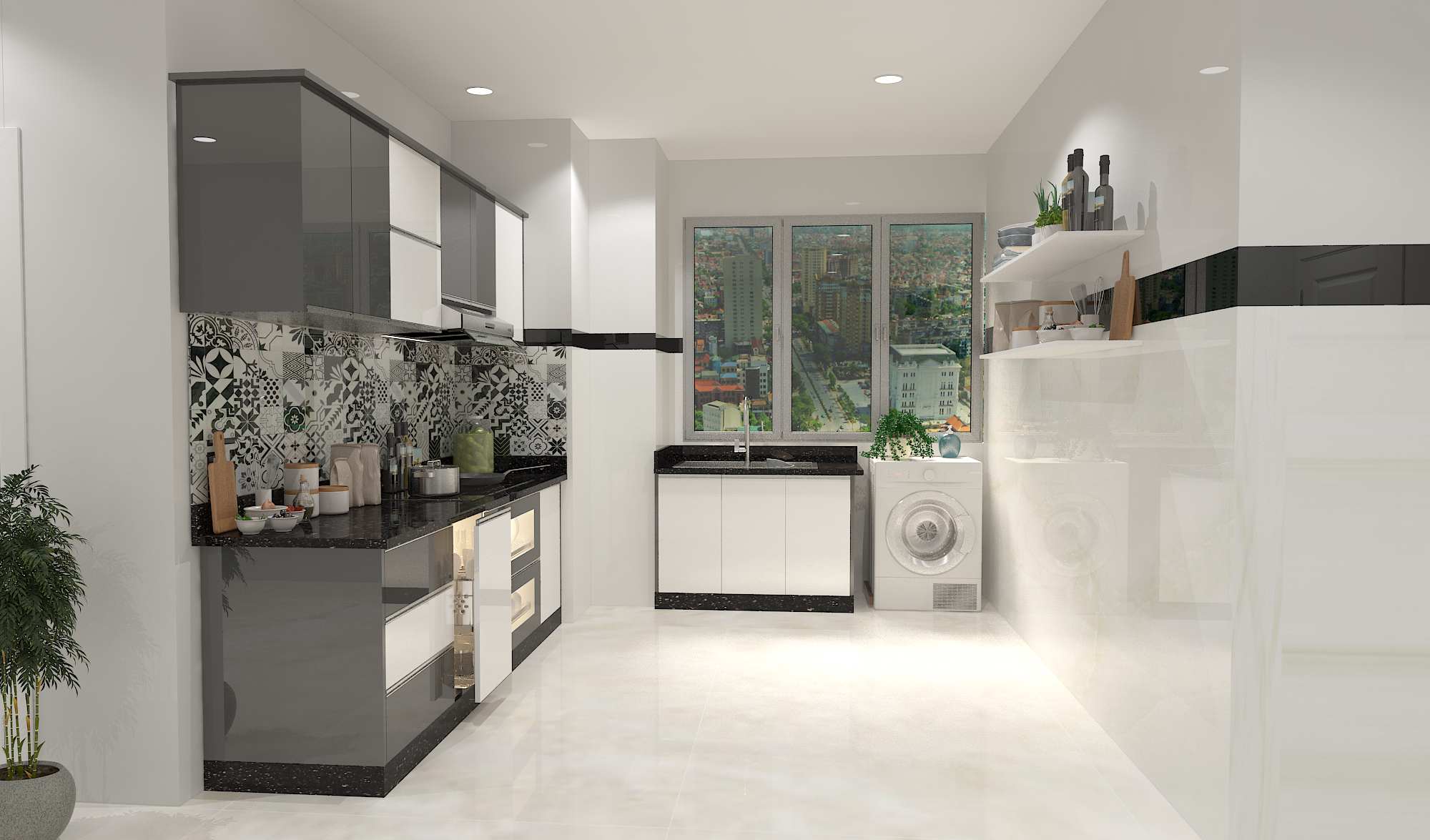 tủ bếp chữ I tone màu xám - đen sang trọng MDF melamine vân gỗ