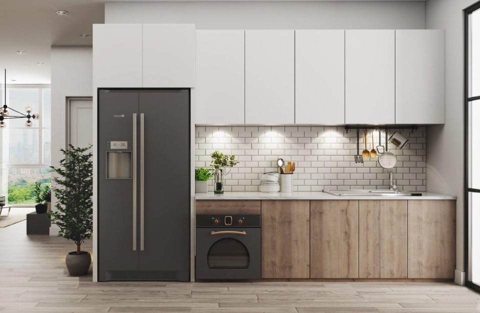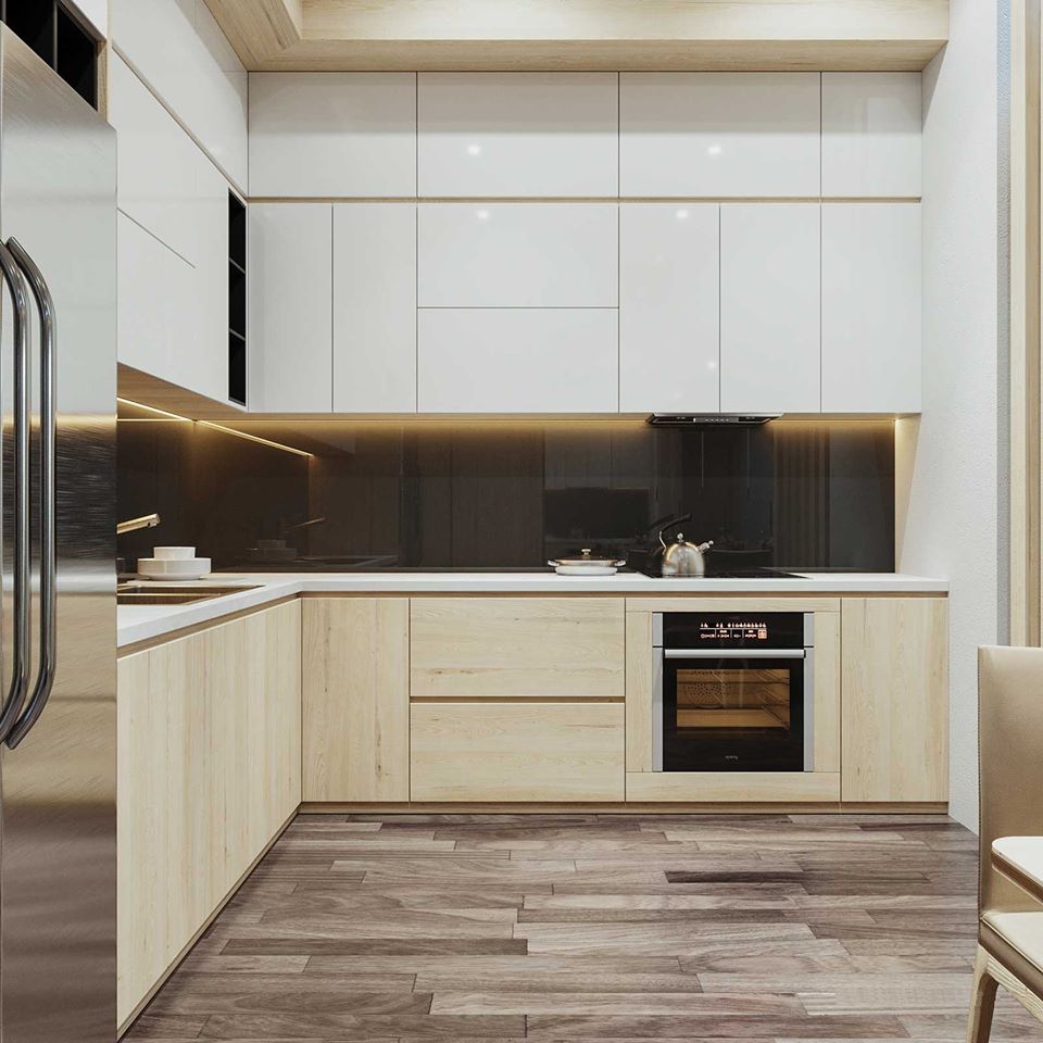 tủ bếp hiện đại phủ laminate màu trắng và vân gỗ
