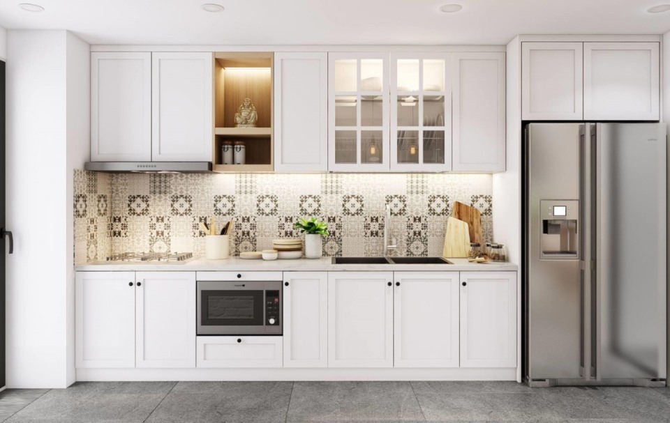 tủ bếp chữ I màu trắng giúp phòng bếp thông thoáng hơn