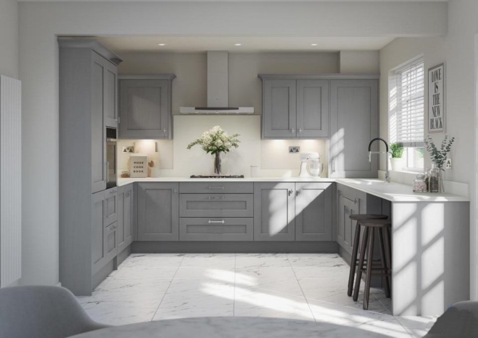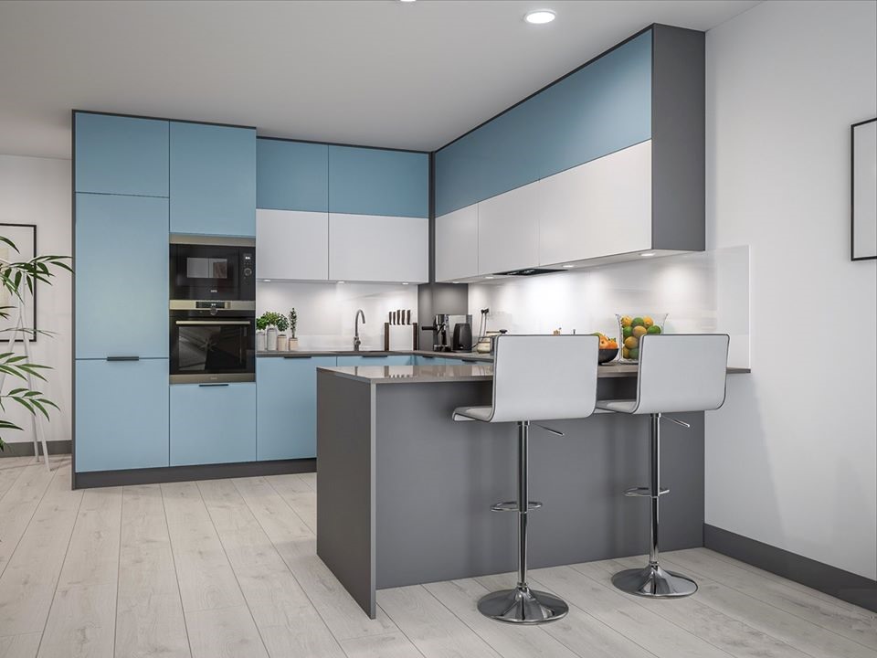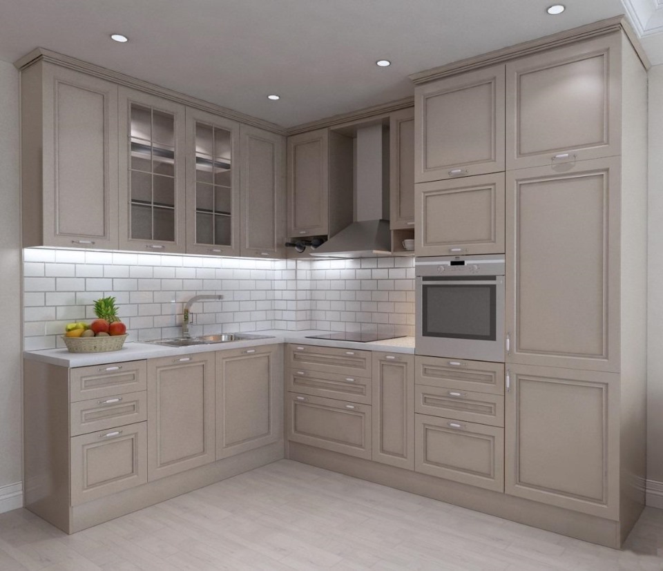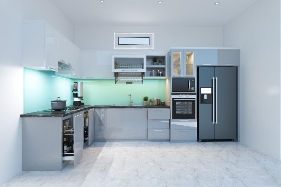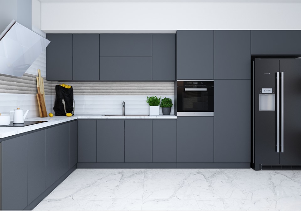 Tủ bếp màu xám trắng chữ L