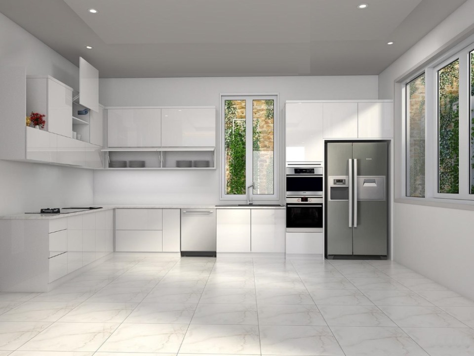 mẫu thiết kế tủ bếp hiện đại, cao cấp phủ melamine trắng