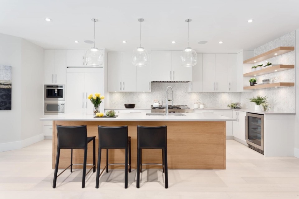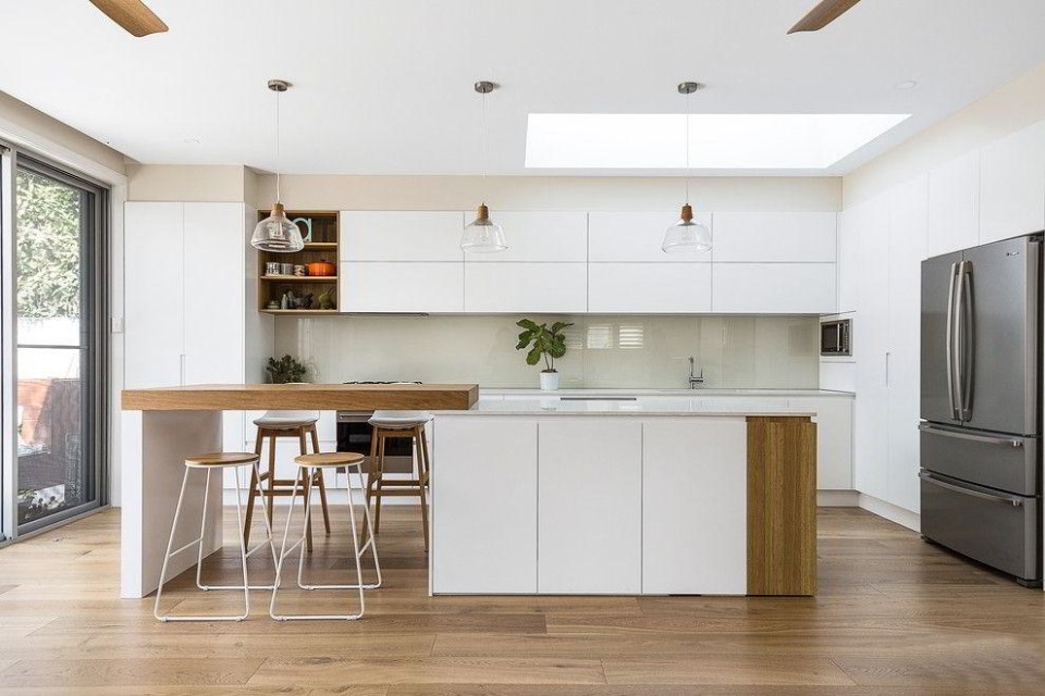 Thiết kế nội thất bếp đẹp và sang trọng hiện đại tủ bếp sơn trắng và bàn đảo bếp veneer vân gỗ